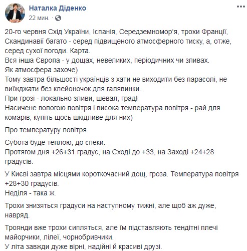 Об этом сообщает синоптик Наталья Диденко на своей Facebook-странице.