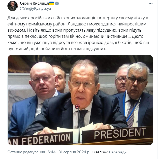 "Для некоторых российских военных преступников умереть в своей постели в элитном пригородном районе может показаться самым простым выходом. Даже если они пропустят скамью подсудимых, они пойдут прямо в ад, чтобы гореть там вечно, минуя чистилище... Некоторые говорят, что он уже склеил ласты, все же, по иронии судьбы, я хотел бы, чтобы он был жив, чтобы увидеть его на скамье подсудимых…", – написал Кислица, опубликовав фото Лаврова.