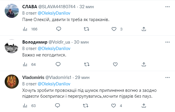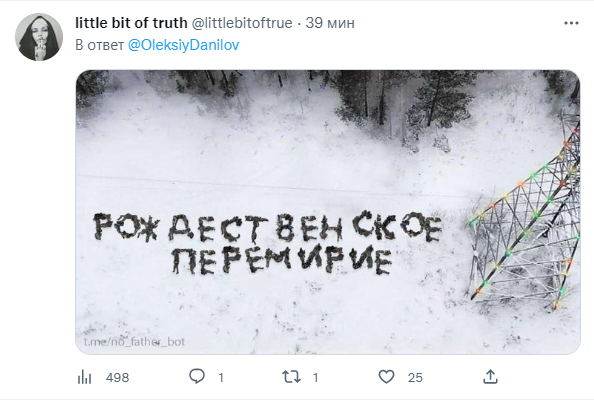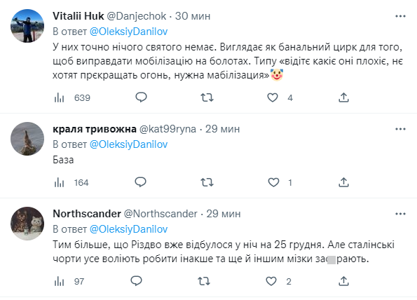"Какое отношение к христианскому празднику Рождества имеет стая мелких кремлевских чертей-иблисов? Кто поверит мерзости, которая убивает детей, обстреливает роддома, пытает пленных? Режим прекращения огня? Ложь и лицемерие. Мы вас грызть будем в поющей тишине украинской ночи", - написал Данилов в твиттере.