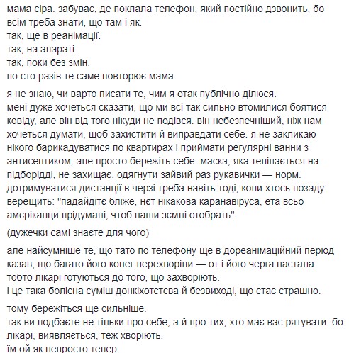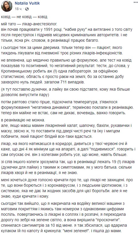 "Не уверена, что медико правильно это формулирую, но тест на ковид показывал то положительный, то отрицательный результат. Тесты, к слову, в Кропивницком делает аж одна лаборатория. По официальной статистике, область есть просто раем на земле, потому что за последние сутки заболело ноль людей. В среднем 711 случаев. потом внезапно стало хуже, подскочила температура, появилась формулировка "отрицательная динамика", срочно положили в реанимацию. Теперь он почти не встает, сам не дышит, очевидно, трудно говорить", - написала она.