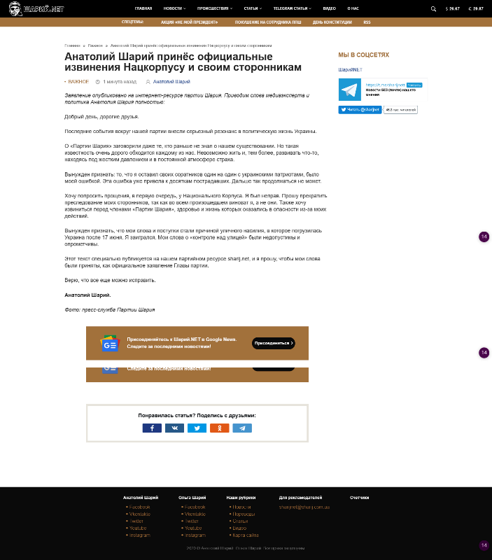 Такое сообщение появилось на партийном сайте Шарий.нет.