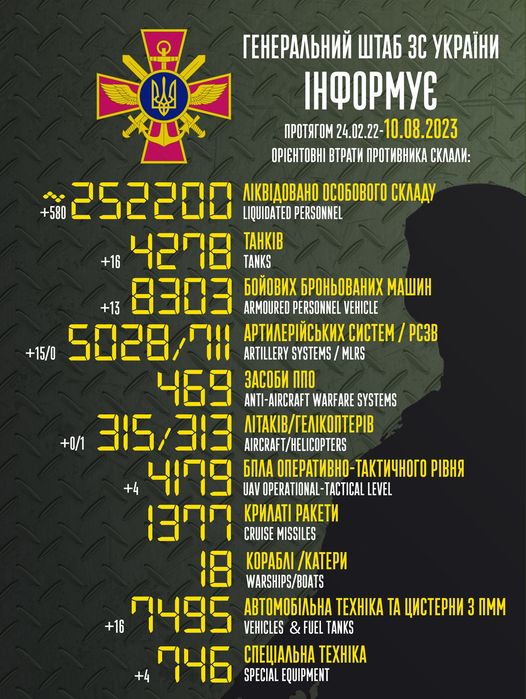 Общие боевые потери противника с 24.02.22 по 10.08.23 ориентировочно составили: