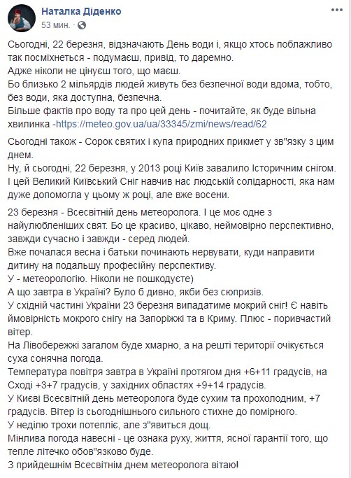 Об этом в Facebook сообщила синоптик Наталья Диденко.