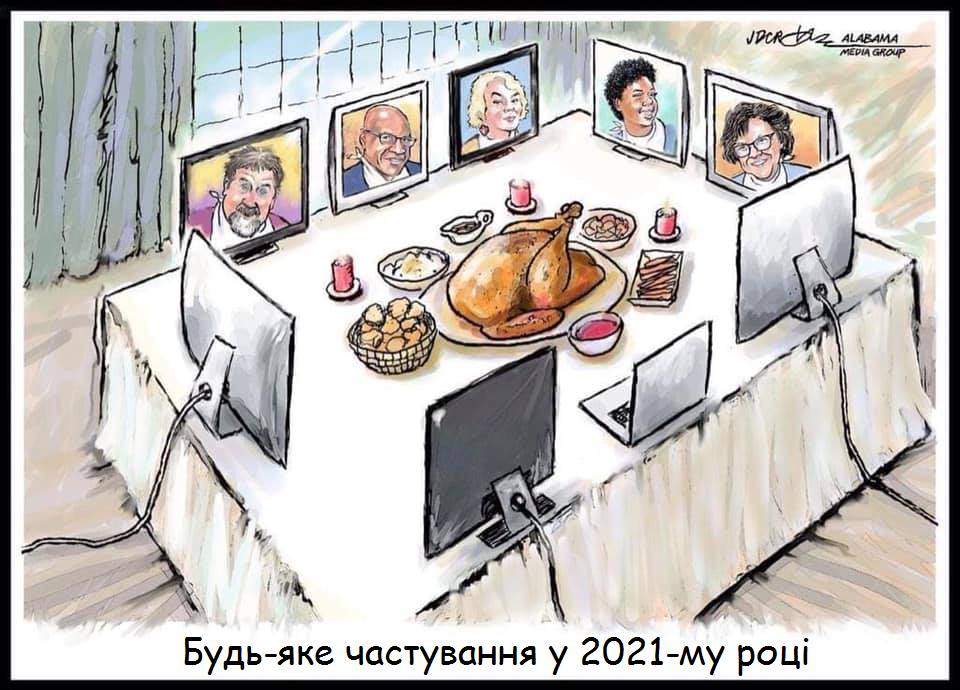 На фотожабе показали новогодний стол, поскольку в стране карантин из-за коронавируса, то в гости ходить нежелательно. Так что, в центре стола запеченая курица и другие блюда, а вместо гостей - экране с лицами. Застолье проводят дистанционно.