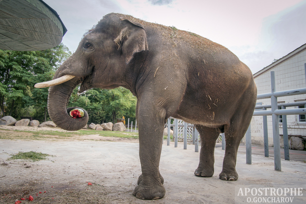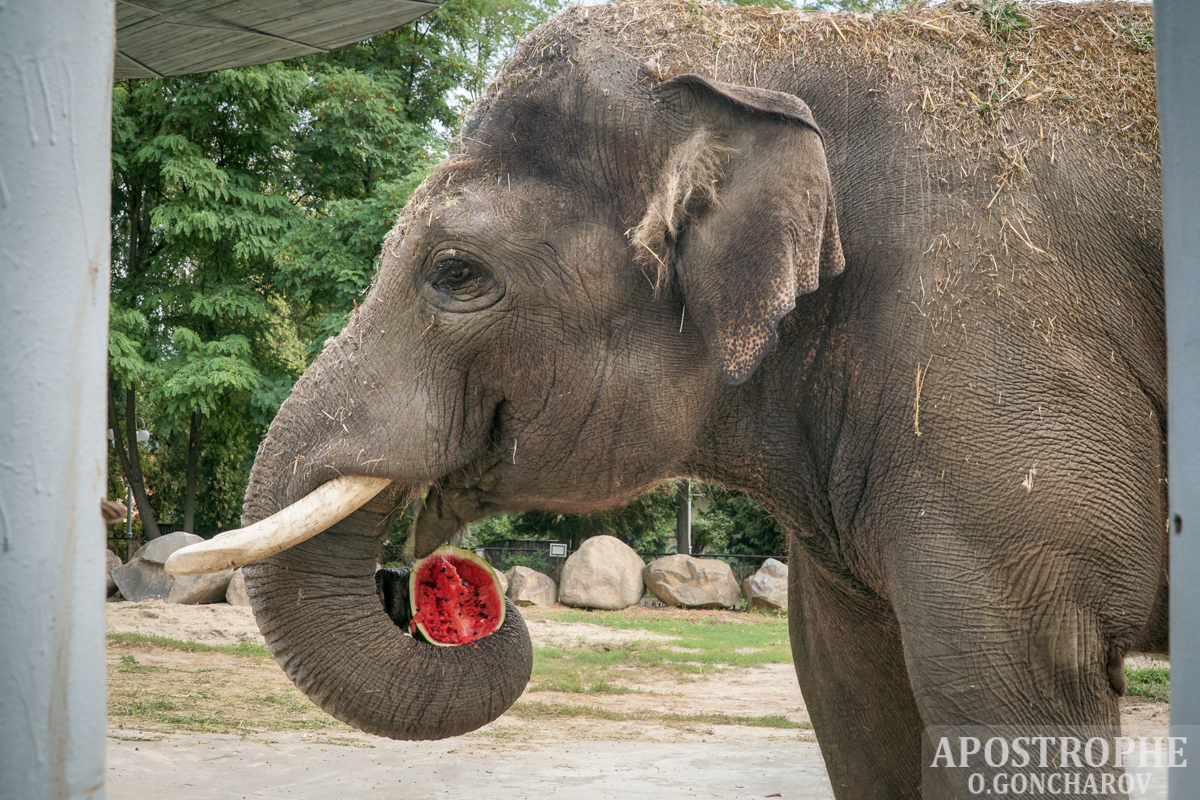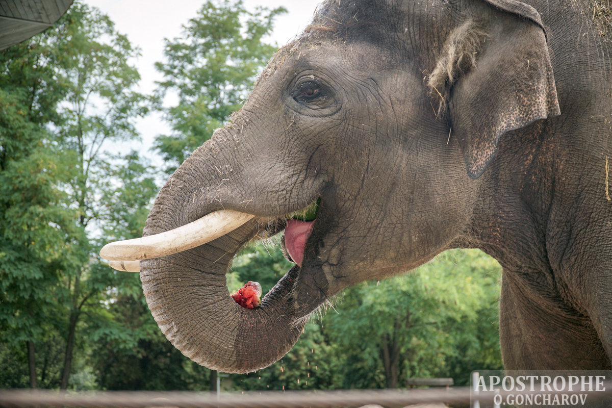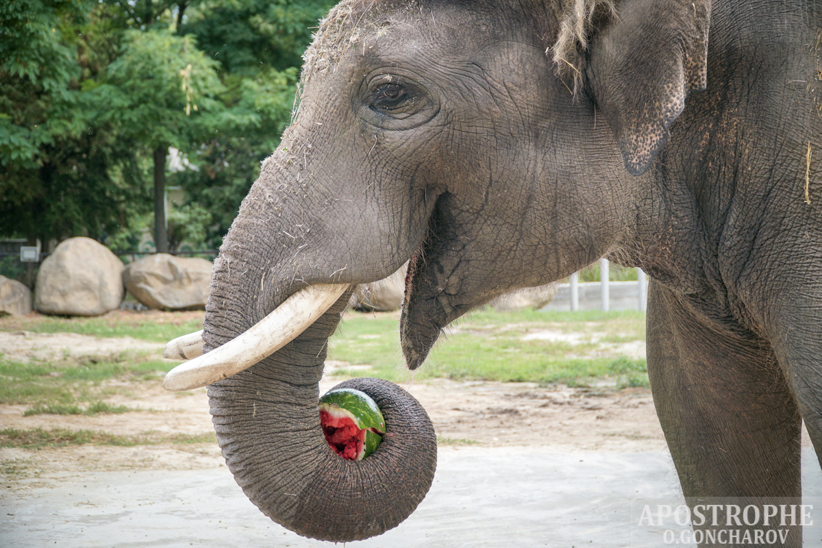 В Киевском зоопарке проходит "Арбузная неделя" - сотрудники зоопарка угощают животных арбузами. Считается, что данная ягода полезна млекопитающим благодаря наличию в ней витаминов.
