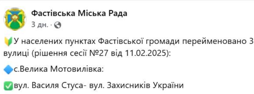 "На официальной странице Фастовского городского совета нет никакого объяснения. И действительно - зачем говорить какие-то слова. Имеют право переименовать - сделали это. При этом карта села свидетельствует о наличии улиц Садова и Урожайна. То есть, в честь Защитников Украины можно было бы вполне спокойно переименовать и не ту, которая названа в честь поэта", - заметил Кипиани.