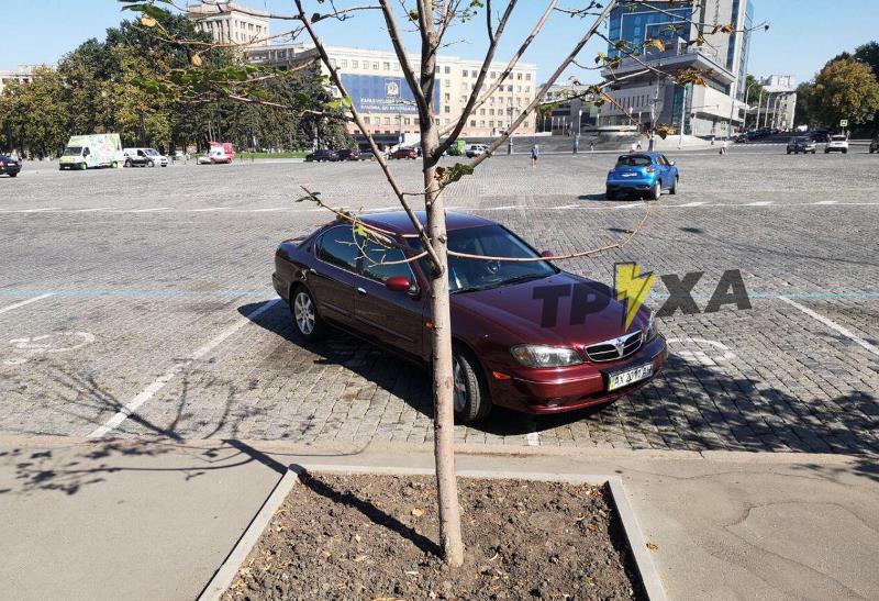 В Харькове на площади Свободы (центр города) водитель припарковал свой автомобиль наискосок сразу на двух местах, выделенных для людей с инвалидностью.