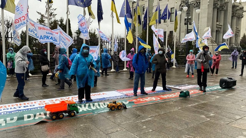 Бессрочная акция протеста объединения инвесторов банка "Аркада" продолжается с 29 мая 2020. Митингующие требуют возобновить строительство 39 домов. Инвесторы развернули палатки под зданием КГГА.