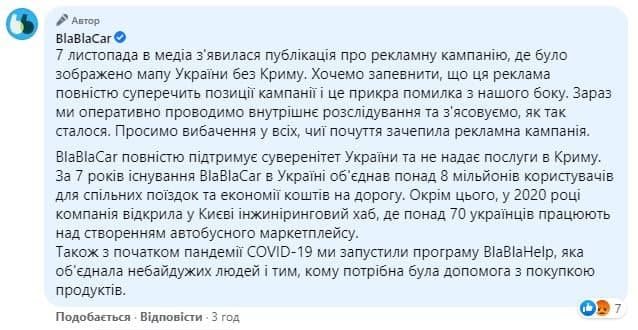 "Сейчас мы оперативно проводим внутреннее расследование и выясняем, как так произошло. Извиняемся перед всеми, чьи чувства затронула рекламная кампания. BlaBlaCar полностью поддерживает суверенитет Украины и не оказывает услуги в Крыму", - говорится в сообщении онлайн-сервиса.