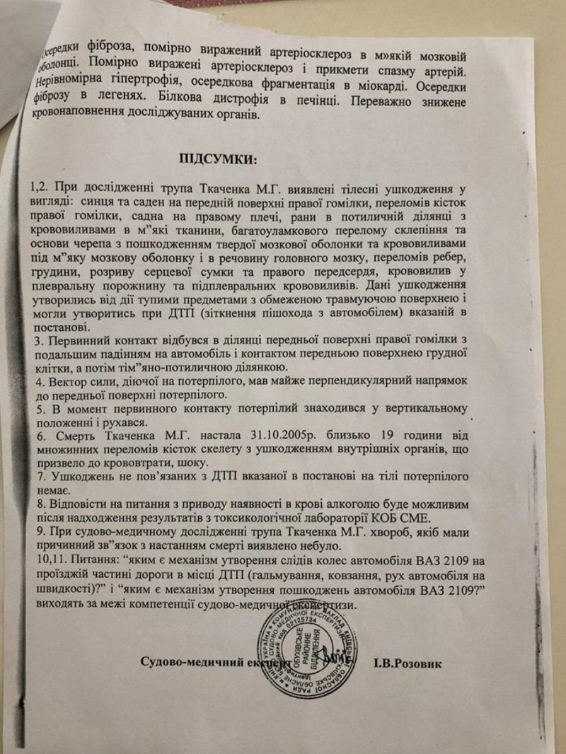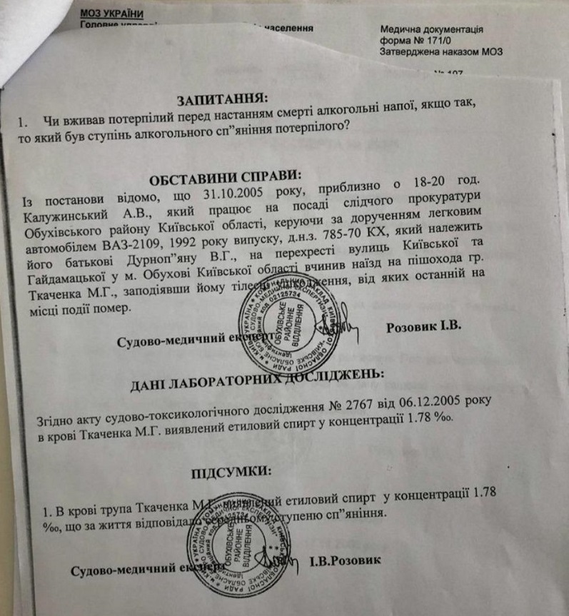 В распоряжении журналистов оказались данные токсикологической экспертизы, согласно которой у потерпевшего Ткаченко в крови нашли 1,78 промилле этилового спирта. Это позволило прокурору избежать наказания за смертельное ДТП. Дело было закрыто судом за отсутствием состава преступления.
