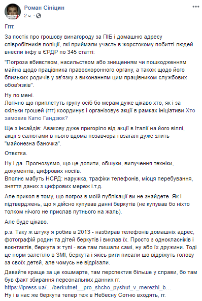 Синицын отметил, что в его публикации в Facebook нет ни угроз, ни подтверждений, что он действительно приобрел персональные данные работников полиции.