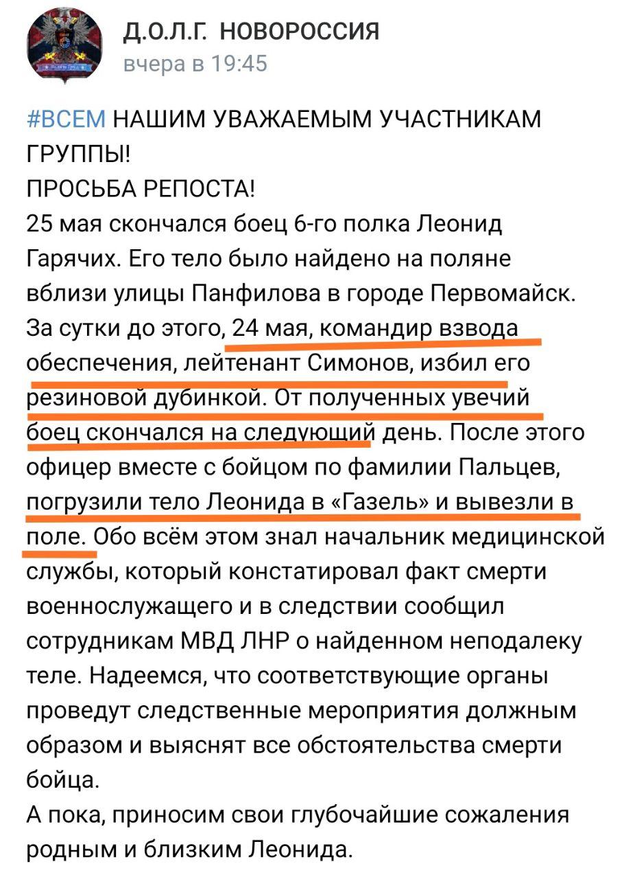 Он добавил скриншот сообщения в группе "Д.О.Л.Г. Новороссия" где сообщается, что Горячих избили резиновой дубинкой, на следующий день от полученных травм он скончался.