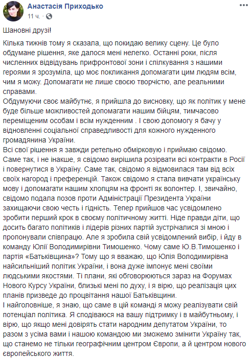 "Теперь пришло время осознанно сделать первый шаг в своей политической жизни. Не скрою, что достаточно много политиков и лидеров различных партий встречались со мной и предлагали сотрудничество. Но я сделала свой осознанный выбор, и иду в команду Юлии Владимировны Тимошенко. Почему именно Ю. В. Тимошенко и партия "Батькивщина"? Потому что я считаю, что Юлия Владимировна сильный политик Украины, и она очень импонирует мне своими человеческими качествами", - написала Приходько.