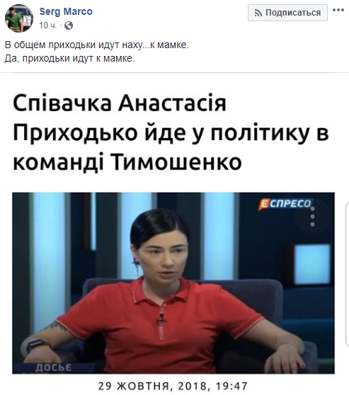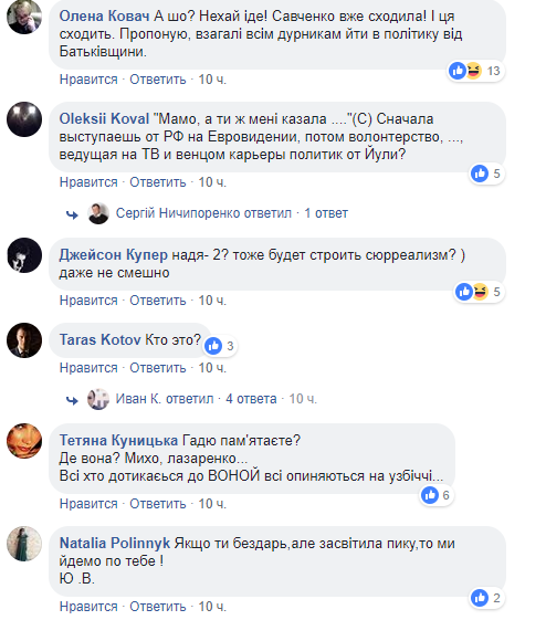 "Свято место пусто не бывает, Надя, подвинься", "посмеемся в полную силу, когда, наконец, узнаем, кто же идет к папке) Поверь, ходоки не разочаруют)", "Что-то Настю тяжело огрело", "А что? Пусть идет! Савченко уже сходила! И эта сходит. Предлагаю вообще всем дурачкам идти в политику от Батькивщины", ""Мамо, а ти ж мені казала...."(С) Сначала выступаешь от РФ на Евровидении, потом волонтерство, ..., ведущая на ТВ и венцом карьеры политик от Йули?", - пишуть комментаторы.