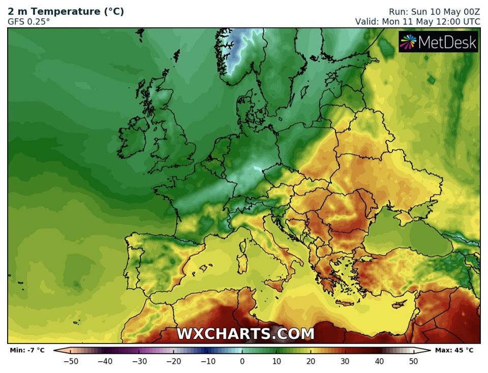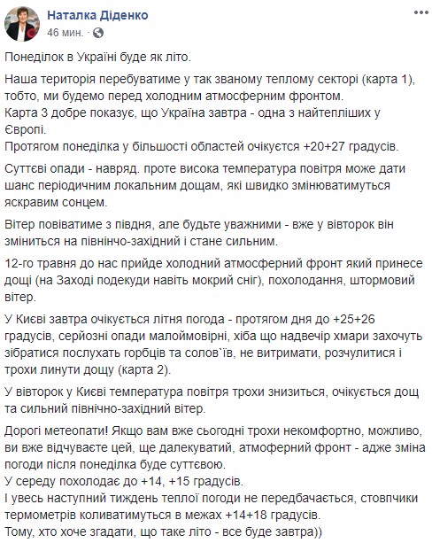 В понедельник, 11 мая, синоптик Наталья Диденко прогнозирует в большинстве областей Украины +20 +27 градусов, но уже во вторник на западе Украины - мокрый снег.