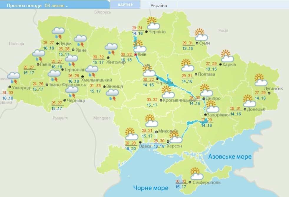 На западе ночная температура будет +16...+19 градусов, на Закарпатье до +19...+21. Днем, несмотря на грозы, будет +28...+32.