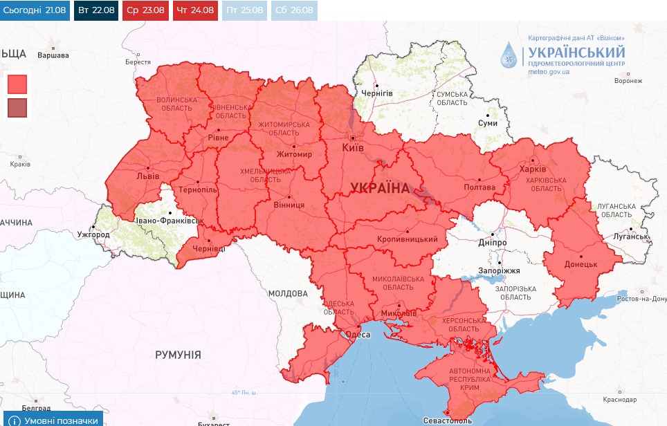 Во вторник, 22 августа, в Украине ожидается снижение температуры воздуха, возможны небольшие дожди, но сохранится чрезвычайный уровень пожарной опасности практически по всей территории страны.