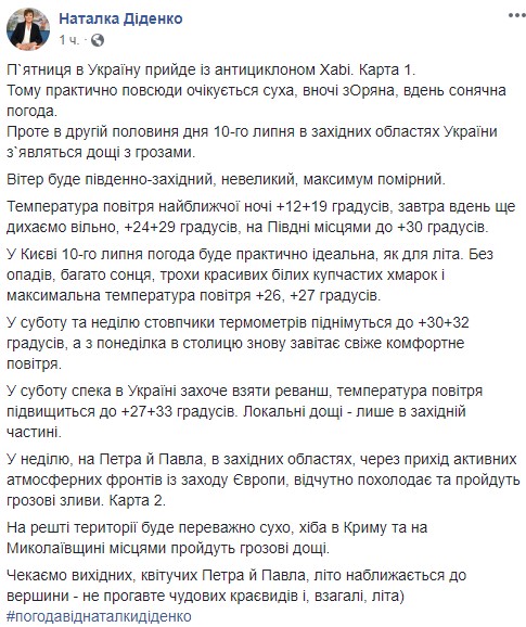 В первой половине дня, 10 июля, ожидается сухая, солнечная погода, но во второй половине - в западных областях Украины возможны дожди с грозами. Ветер будет юго-западный, небольшой, максимум умеренный.