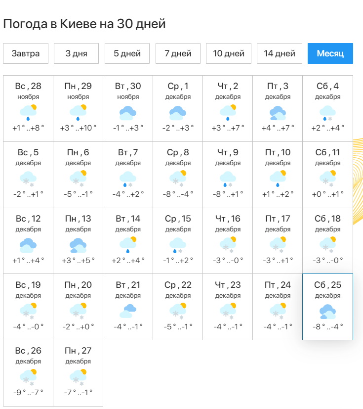 В Киеве погода в этот день будет пасмурной, температура воздуха ночью составит -8℃, а днем – -4℃. Влажность составит 75%, скорость ветра составит 2, 78 м/с.