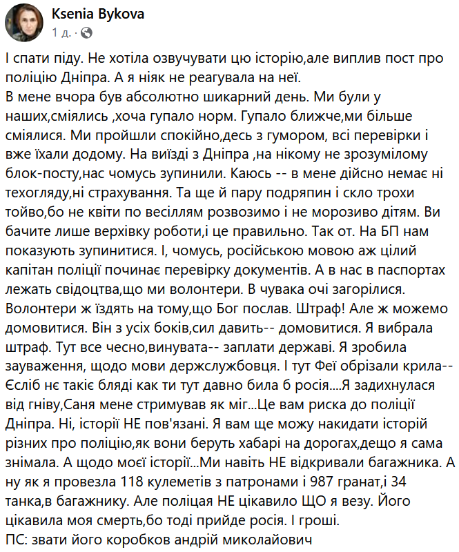 "На выезде из Днепра, на никому не понятном блокпосту, нас почему-то остановили. Каюсь - у меня действительно нет ни техосмотра, ни страхования. Да еще и пару царапин и стекле немного таво, потому что не цветы на свадьбы развозим и не мороженое детям. Вы видите только верхушку работы, и это правильно. Так вот. На БП нам показывают остановиться. И, почему-то, на русском языке целый капитан полиции начинает проверку документов. А у нас в паспортах лежат свидетельства, что мы волонтеры. У чувака глаза загорелись. Волонтеры же ездят на том, что Бог послал. Штраф! Но ведь можем договориться. Он со всех сторон, сил давить - договориться. Я выбрала штраф. Здесь все честно, виновата - заплати государству", - написала она.