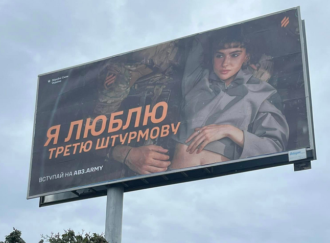 Как отмечается, предметом обсуждения стали билборды с надписью "Я люблю Третью штурмовую", где женщины – гражданские, а мужчины – военные.