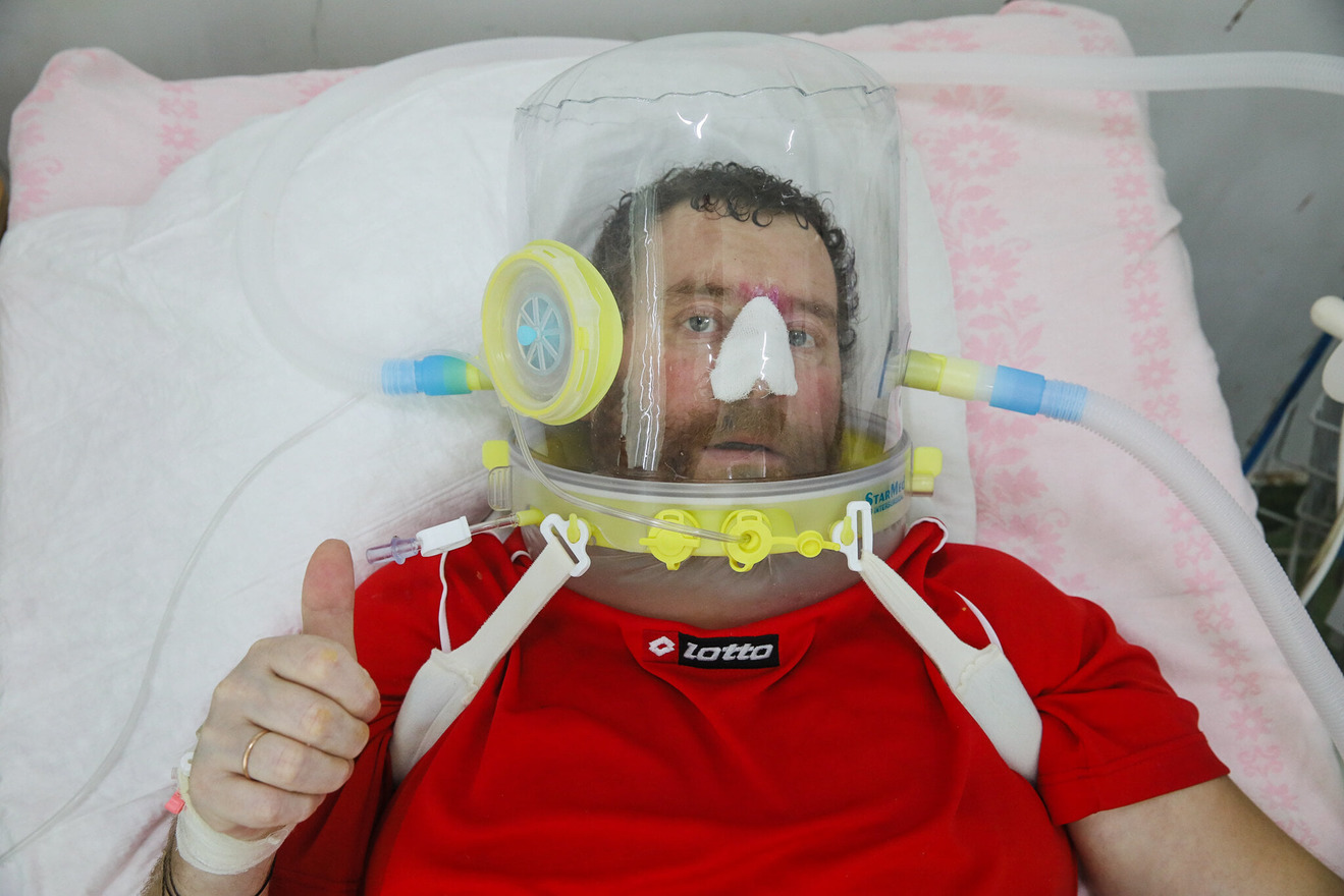 Один из пациентов больницы Василий уже три месяца находится в реанимации. Он так долго находился в кислородной маске, что его нос начал гнить. Медикам пришлось перевести его на другой аппарат и теперь он получает кислород через специальный шлем.
