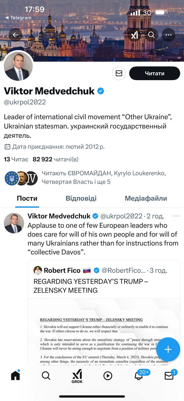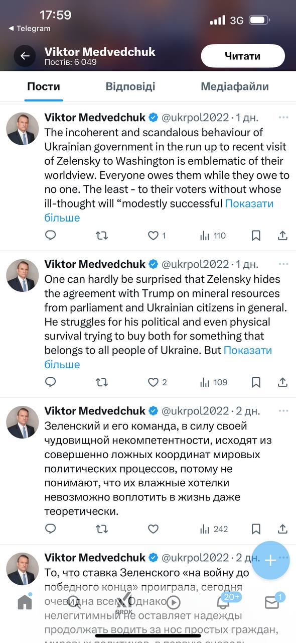 Замечает, что речь об аккаунте Медведчука в соцсети Х. Подчеркивает интересную закономерность: