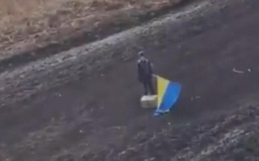 На видео видно, как ребенок, несмотря на безумный звук боевых вертолетов и опасность, приветствуя их, традиционно поднял желто-голубой флаг.