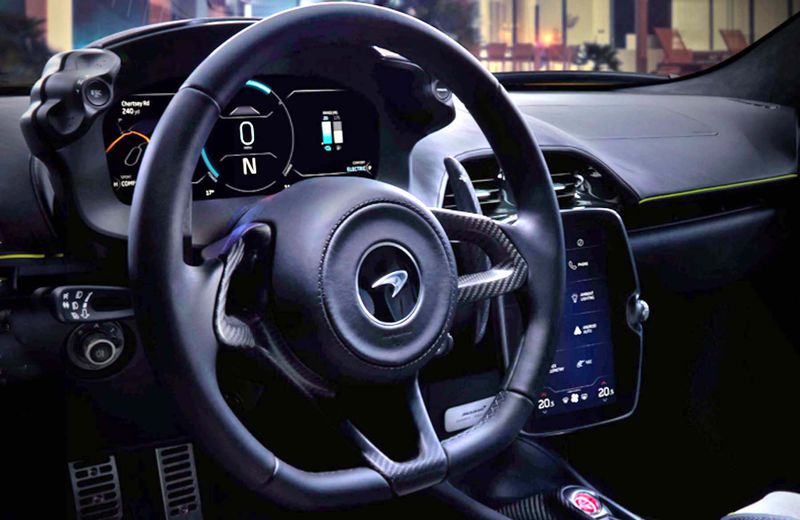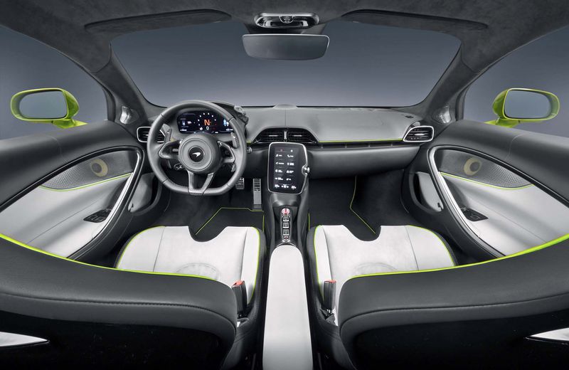 Салон этой модели - сочетание минималистичной и функциональной роскоши. Дизайн сиденья Clubsport обеспечивает комфорт в повседневной езде. Информационно-развлекательную систему и связь представляют два экрана, которые дают водителю доступ к Apple CarPlay, Android Auto, обновлений программного обеспечения Over-the-Air и последним телеметрическим данным McLaren Track.