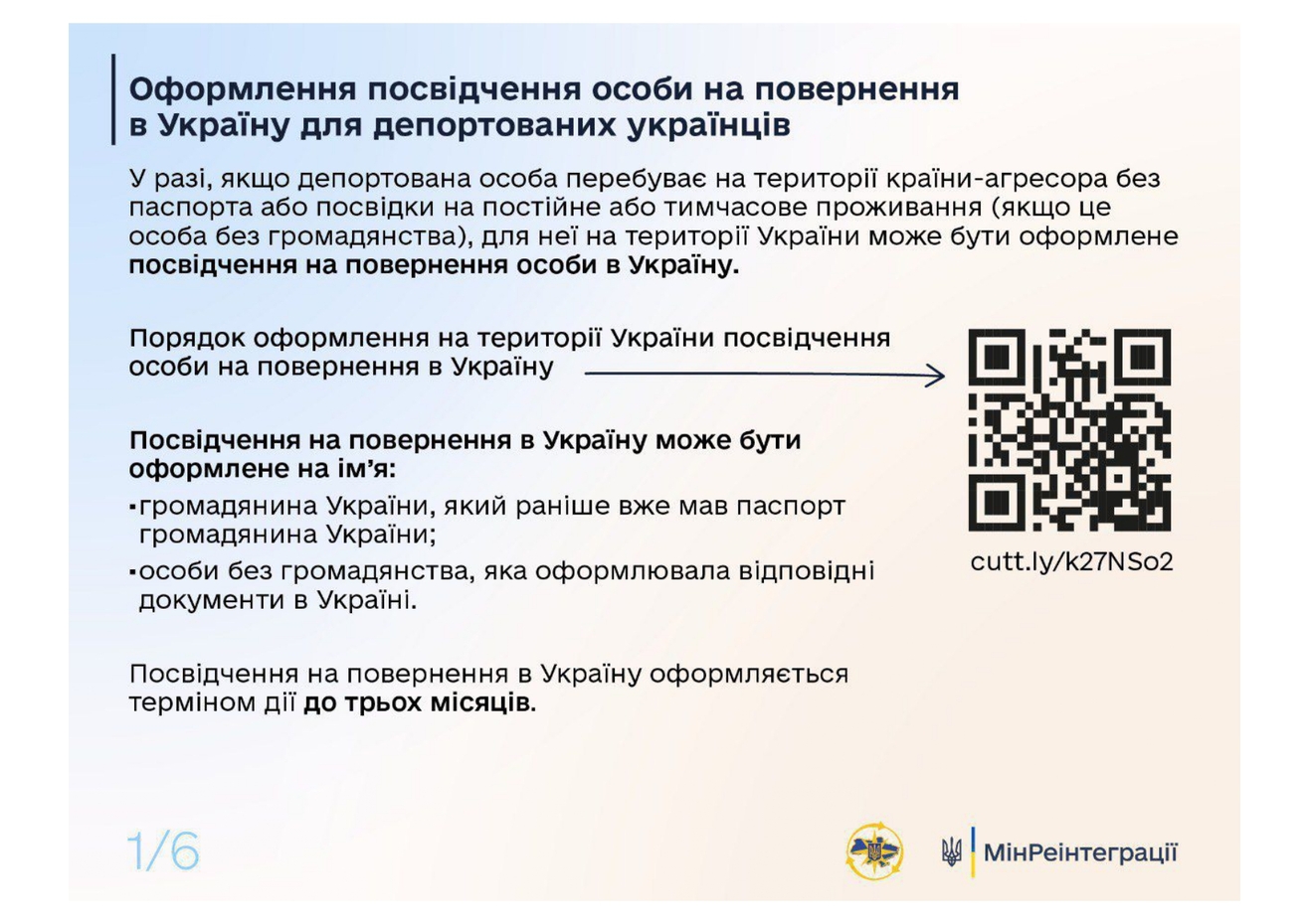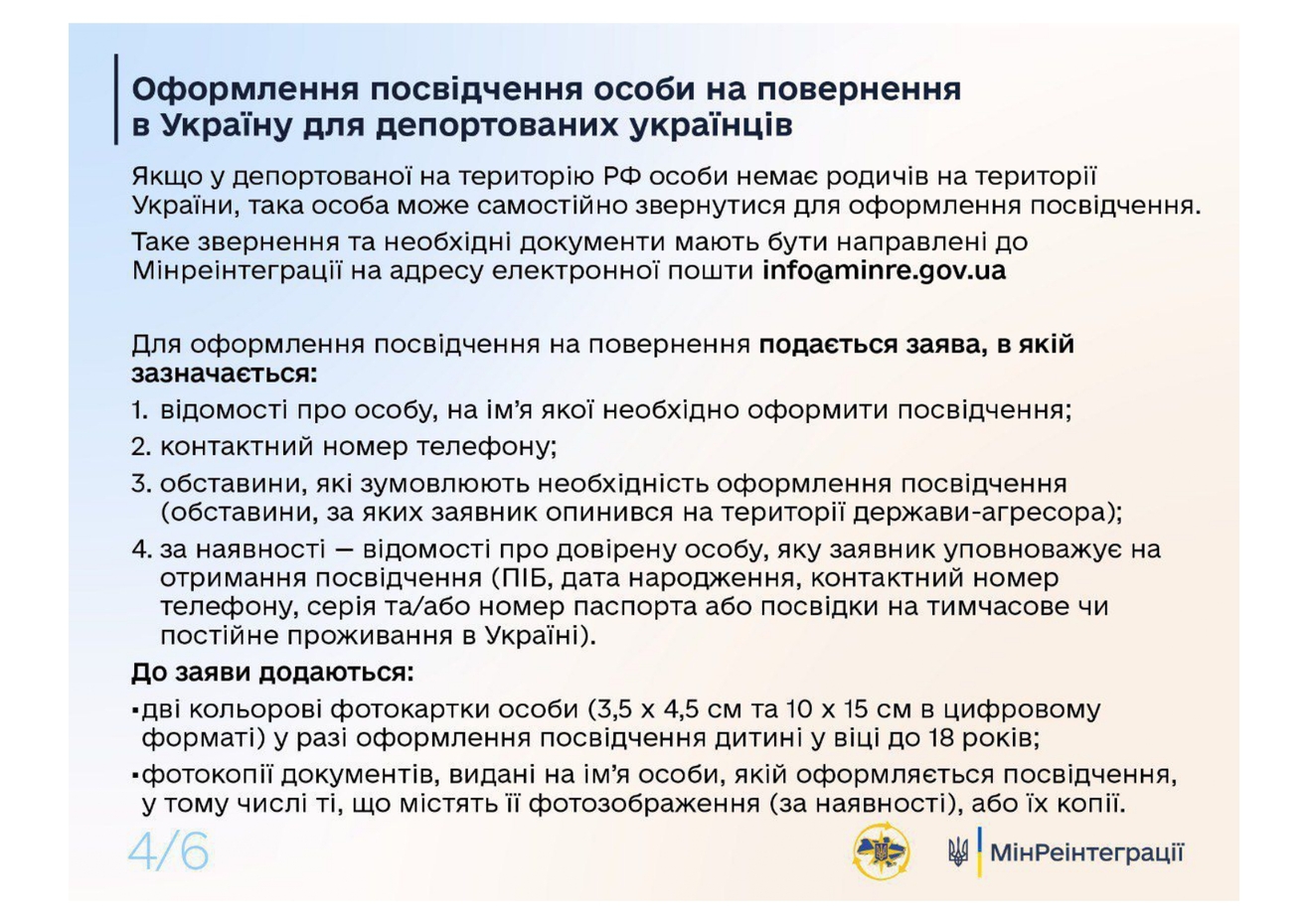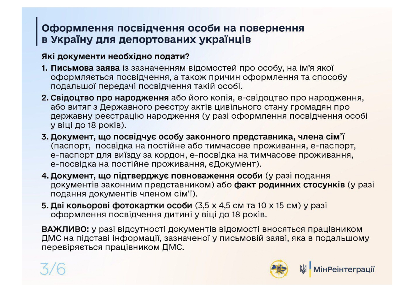 В случаях, если депортированные люди находятся на территории России без документов, удостоверяющих личность, они имеют право оформить удостоверение на возвращение в Украину.