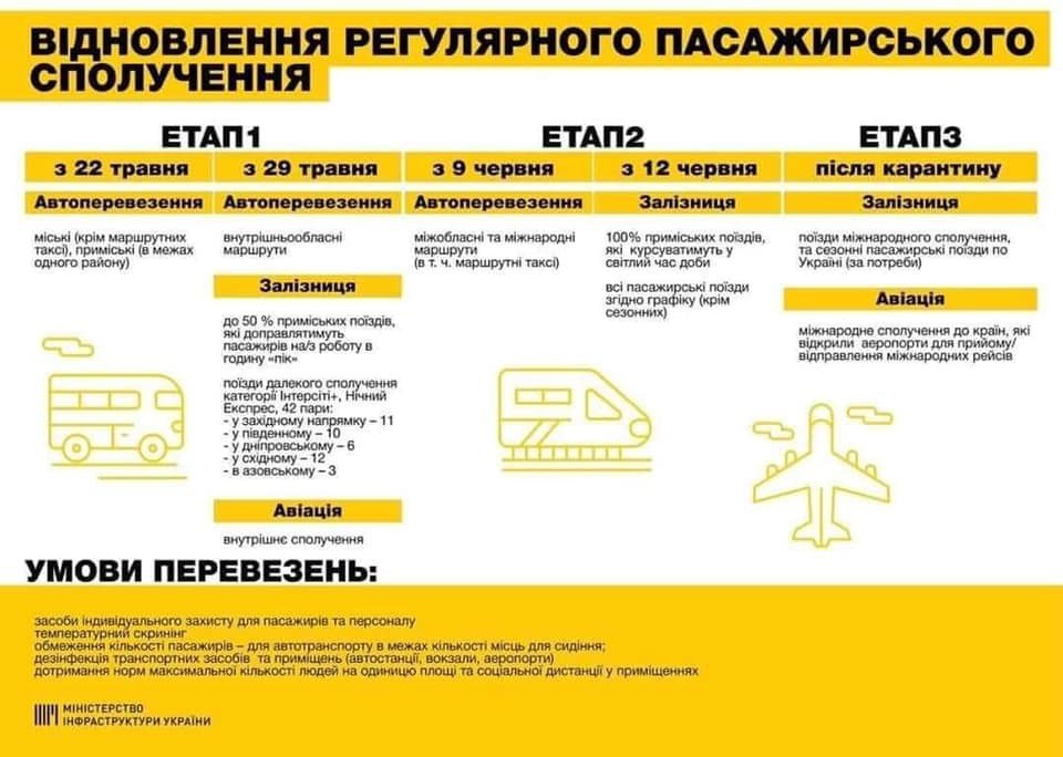С 29 мая планируется запуск внутриобластных автоперевозок. Также до 50% пригородных поездов и 42 пары поездов дальнего следования категории "Интерсити+", "Ночной экспресс": в западном направлении – 11 пар, в южном – 10, в днепровском – 6, в восточном - 12, в азовском – 3.