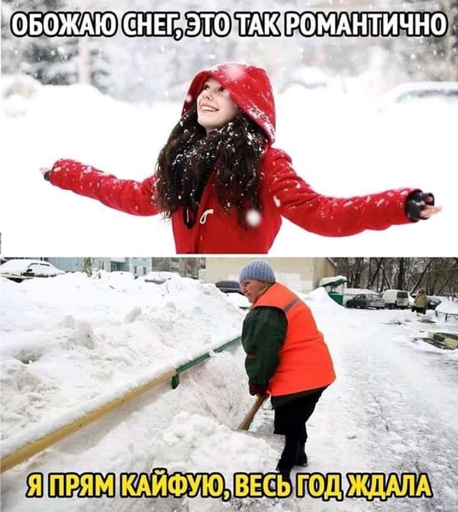 На одной из картинок - контраст, с которым снегопады воспринимают обычные украинцы и работники коммунальной сферы. Она состоит из двух частей. На первой изображена девушка.
