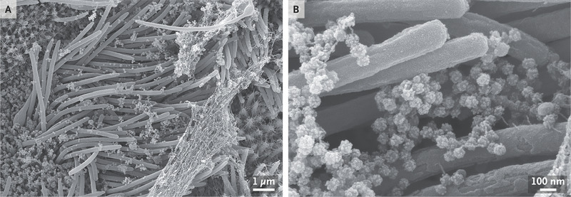 Оптика зафиксировала зараженную ресничную клетку с нитями слизи на кончиках ресничек. При большем увеличении видна структура и плотность вирионов (полноценных вирусных частиц, состоящих из нуклеиновой кислоты и капсида) SARS-CoV-2, продуцируемых эпителиальными клетками дыхательных путей человека.