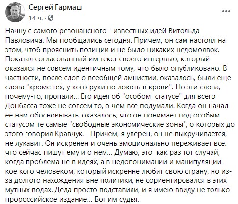 "Нужно отметить, что именно Леонид Макарович настоял, чтоб мне, вопреки крикам Грызлова, все-таки дали возможность говорить. И указал, что Украина сама будет решать, кого ей включать в свою делегацию, и что у нас все члены делегации равны. В общем, я даже не думал, что всегда такой спокойный и отдаленно-холодный Грызлов, может так истерить. Это еще предмет для анализа – почему они так возбудились на нас…", - написал Гармаш.