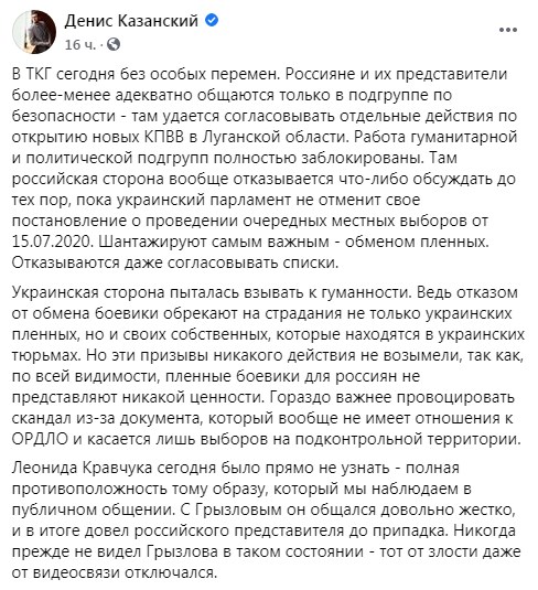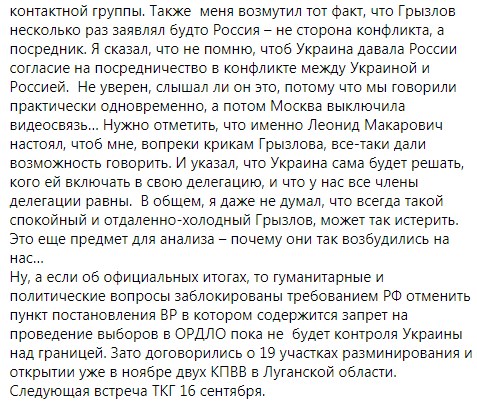 Он подчеркнул, что истерика той стороны началась еще на гуманитарке, где они заблокировали обмен пленными, мотивируя это необходимостью отмены известного постановления Верховной Рады о проведении местных выборов.