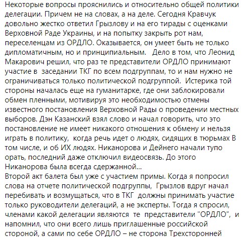 "Леонида Кравчука сегодня было прямо не узнать - полная противоположность тому образу, который мы наблюдаем в публичном общении. С Грызловым он общался довольно жестко, и в итоге довел российского представителя до припадка. Никогда прежде не видел Грызлова в таком состоянии - тот от злости даже от видеосвязи отключался", - написал он.