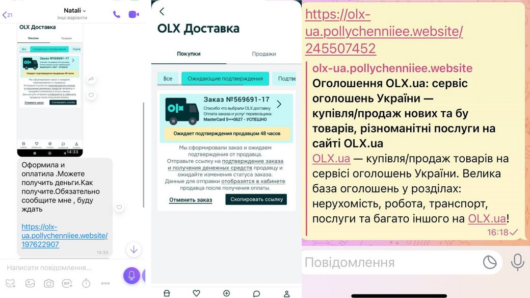 После чего спрашивают о возможности оформления заказа путем OLX Доставка, обещая взять на себя расходы. После чего происходит "оплата товара", где вместе с уведомлением о ее подтверждении посылается ссылка на сайт. "Покупатель" просит подтвердить получение средств, перейдя по специальной ссылке, которая на самом деле является сайтом-подделкой и выглядит почти как настоящий сервис OLX. Главное отличие – адрес ссылки. Если по нему перейти, то высветится якобы оформленный заказ, тогда как на настоящем сайте в разделе доставки не будет подтвержденного заказа.
