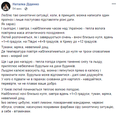 "И сегодня, и завтра, и в ближайшее время над Украиной - теплая влажная воздушная масса атлантического происхождения. Февраль начнется, как и завершается январь - ночью около нуля, днем 1 +4 градуса, на юге + 4 +9 градусов, в Крыму до 12 градусов", - написала она.