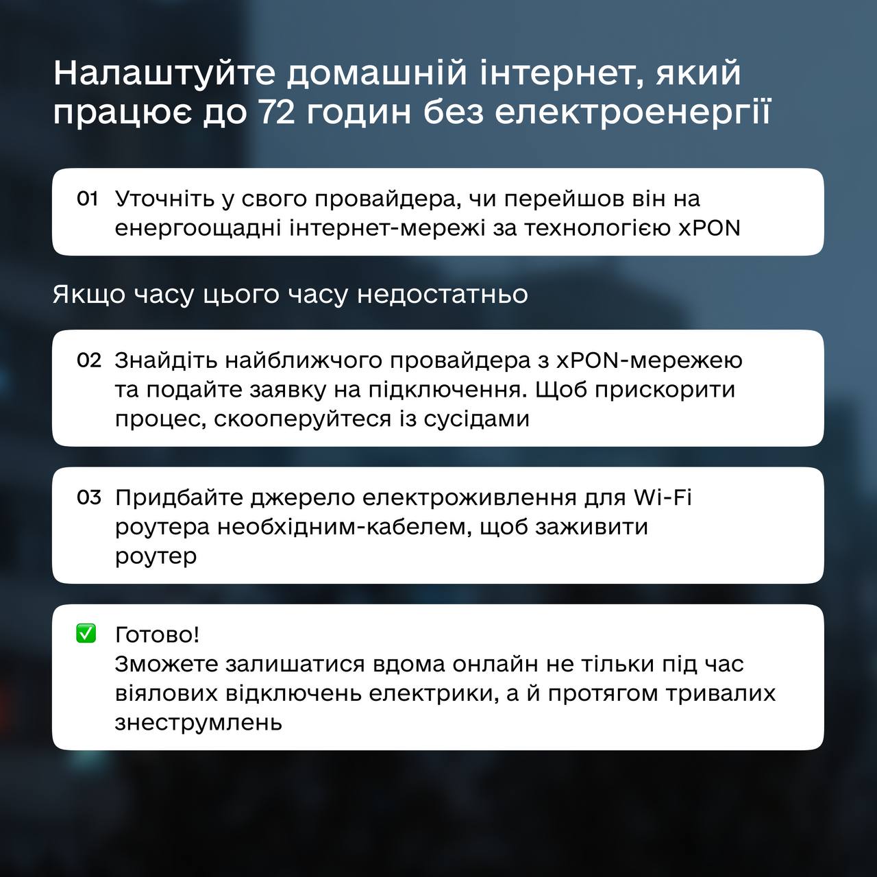 В частности, в Министерстве советуют украинцам предварительно позаботиться о подключении к интернет-провайдеру, у которого есть x-PON сеть.