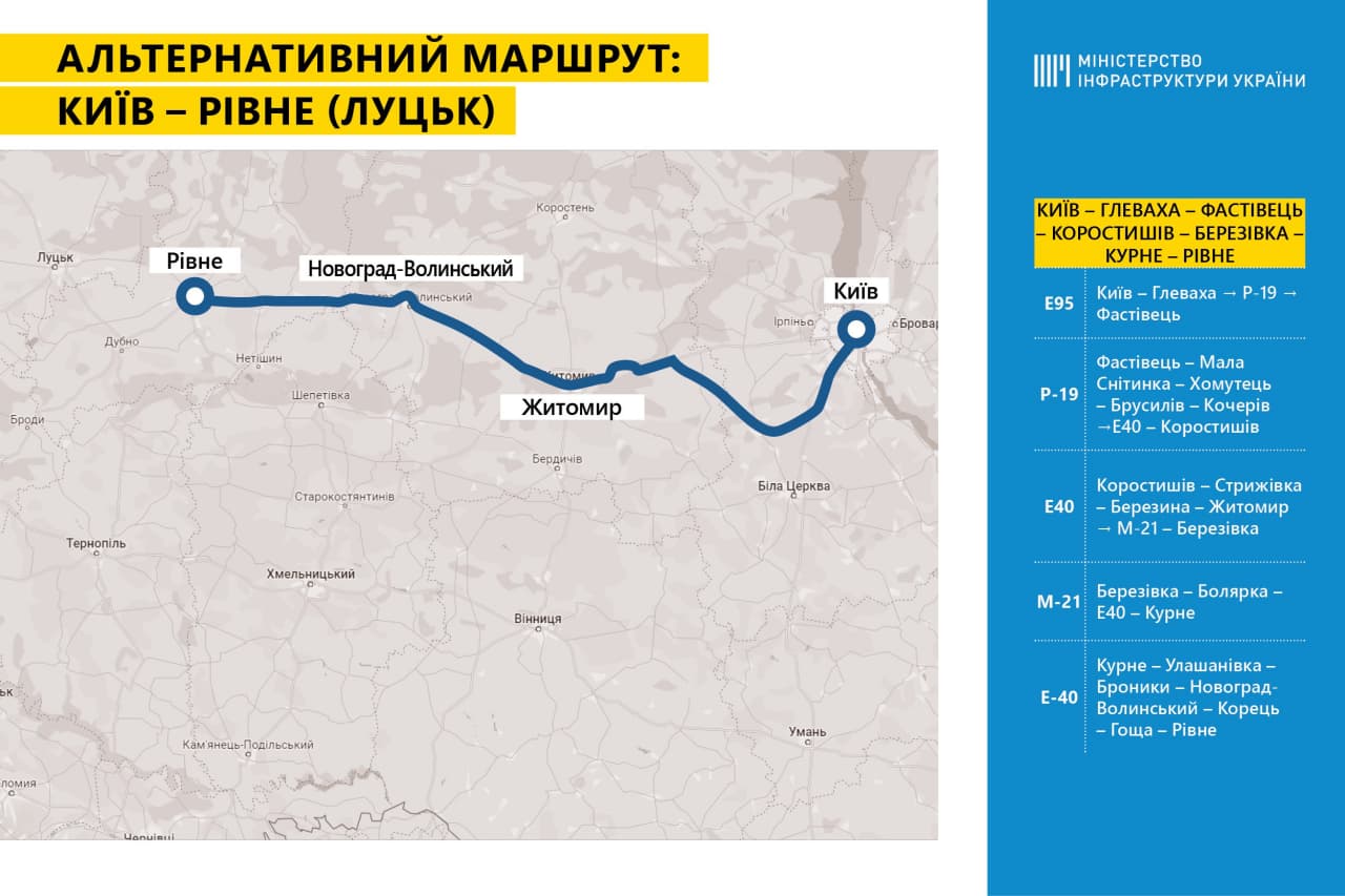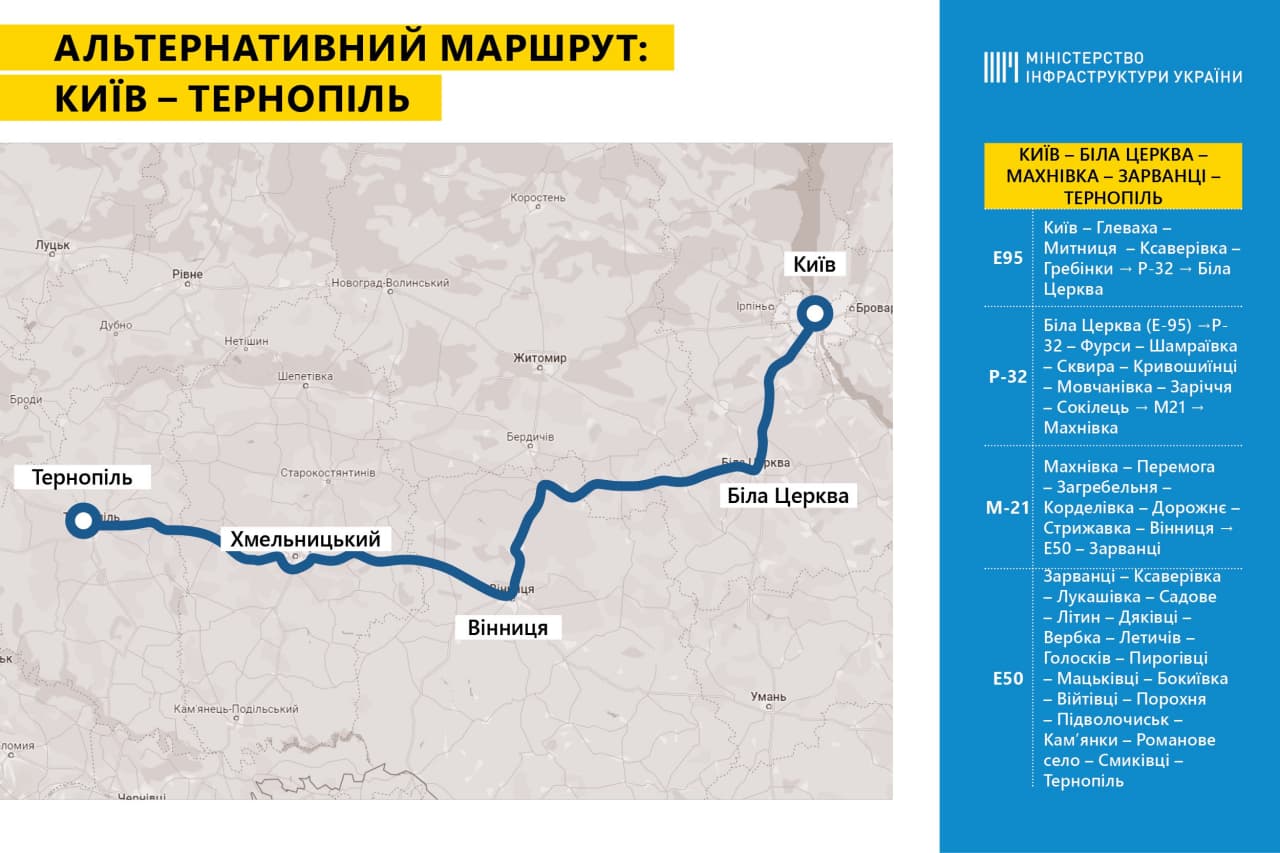 Ведомство подготовило карты таких маршрутов для автомобилей: Днепр-Тернополь, Киев-Тернополь (два маршрута), Полтава-Тернополь, Николаев-Тернополь, Киев-Ровно (Луцк).