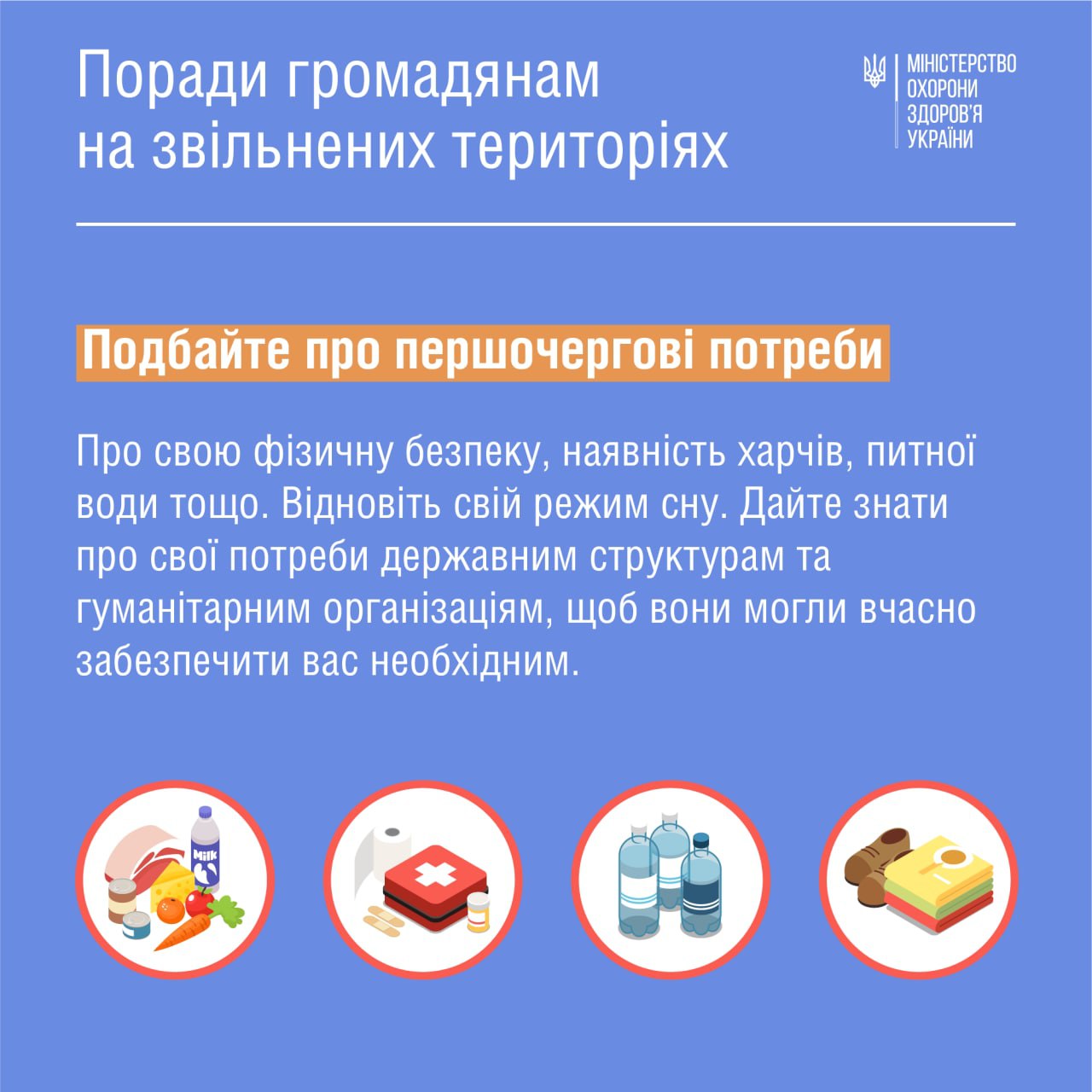 2. Первоочередные потребности. Физическая безопасность, наличие еды, питьевой воды, тепла – об этом все нужно позаботиться в первую очередь, как и о медицинском обследовании. Также следует восстановить режим сна. О потребностях нужно сообщать государственным структурам и гуманитарным организациям, тогда они вовремя обеспечат всем, в чем очень нуждается человек.