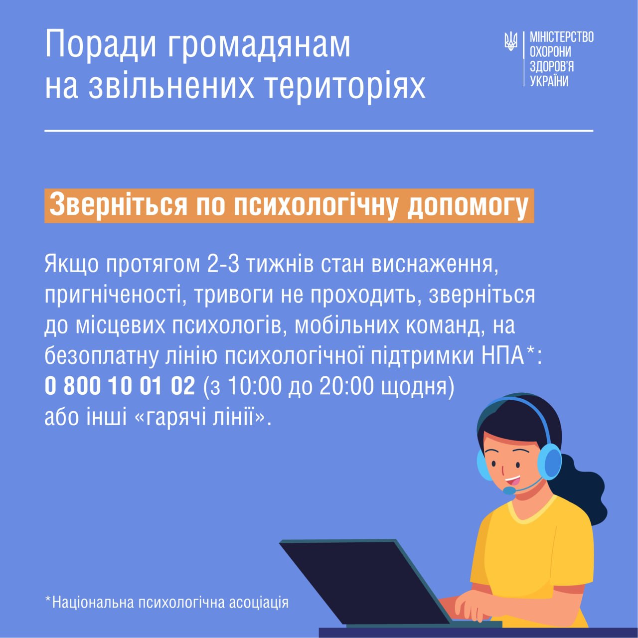 8. Обращение за психологической помощью. В случае продления более 2-3 недель истощения, подавленности, чрезмерной тревоги, нужно обратиться к местным психологам, мобильным командам или бесплатной линии психологической поддержки НПА: 0 800 10 01 02. Линия работает с 10:00 до 20:00. Кроме того, можно обратиться на другие "горячие линии".