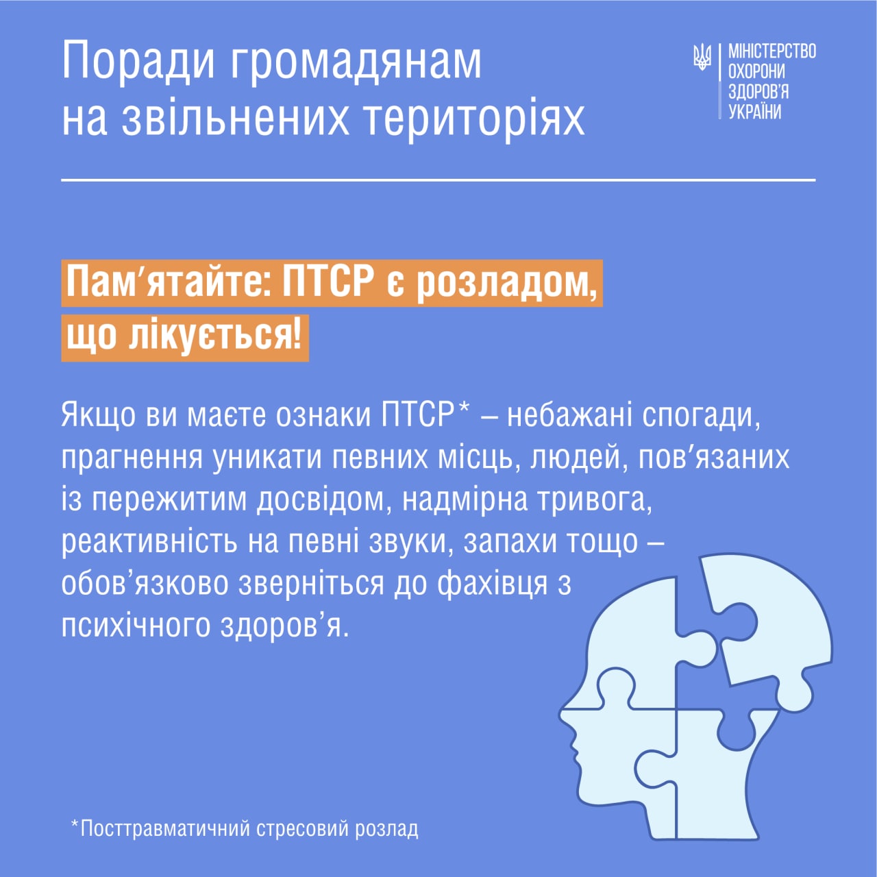 7. Следует помнить, что ПТСР лечится. Признаками ПТСР (посттравматическое стрессовое расстройство) есть неприятные воспоминания, стремление избежать конкретных мест, людей, связанных с пережитым, чрезмерная тревога, реакция на определенные звуки, запахи. Если такие признаки расстройства есть – нужно срочно обратиться к специалисту по психическому здоровью. Ниже есть телефоны, по которым можно получить всю необходимую информацию.