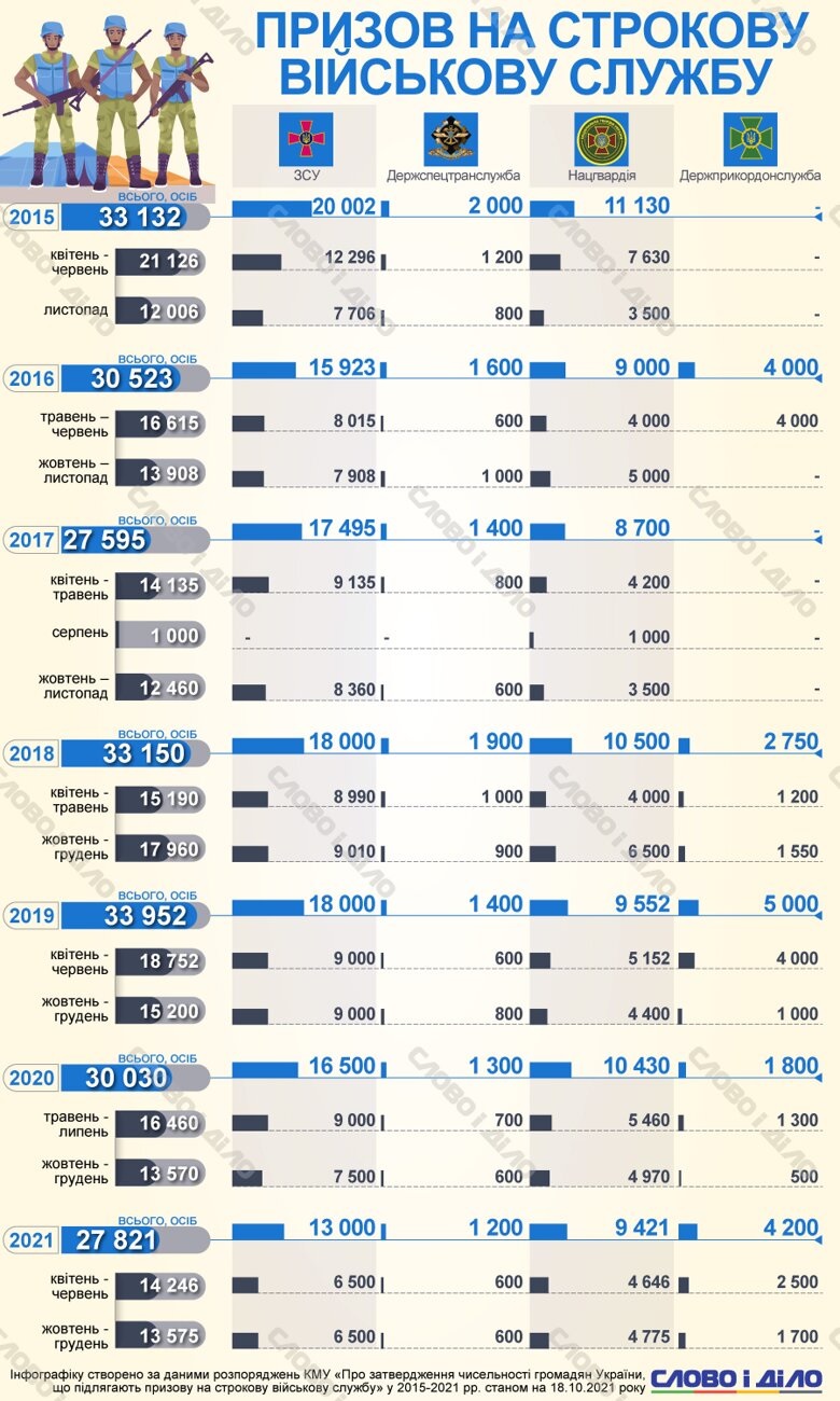 В 2015 году было призвано 33132 лиц. Из них 20 тысяч пополнили ряды ВСУ, 11130 – Нацгвардию. В период с апреля по июнь были призваны 21 тысяча новобранцев.