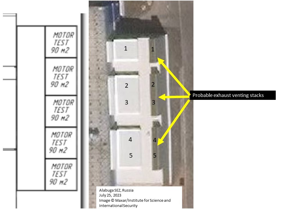 Дополнение к зданию 8.2 появилось после апреля 2023 года и соответствует размерам пяти мотоиспытательных камер для производства Shahed-136, включенных в схему здания.