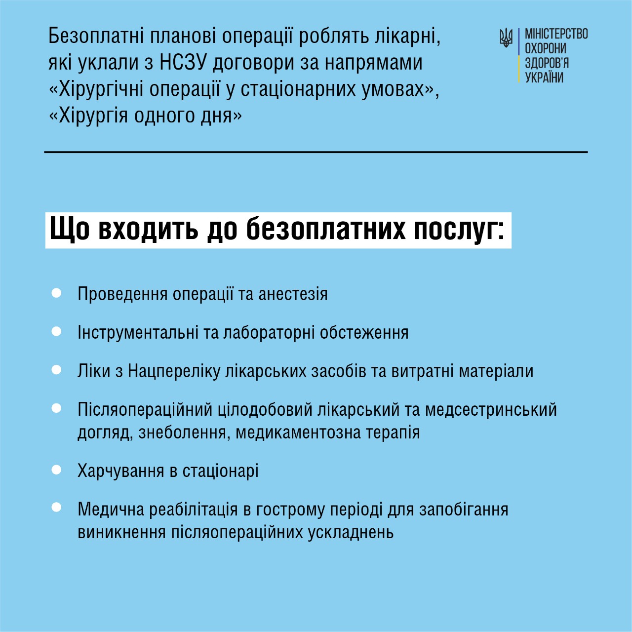 Плановые операции проводятся бесплатно, если медучреждение заключило договоры с НСЗУ (Национальной службой здоровья Украины) по направлениям "Хирургические операции в стационарных условиях" и "Хирургия одного дня".