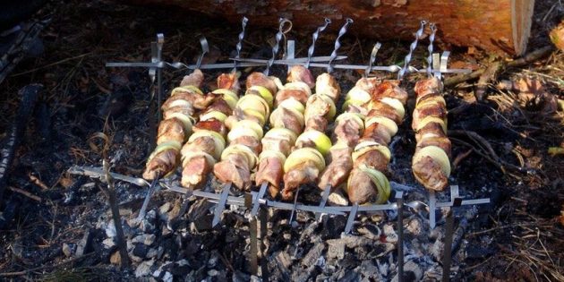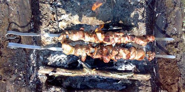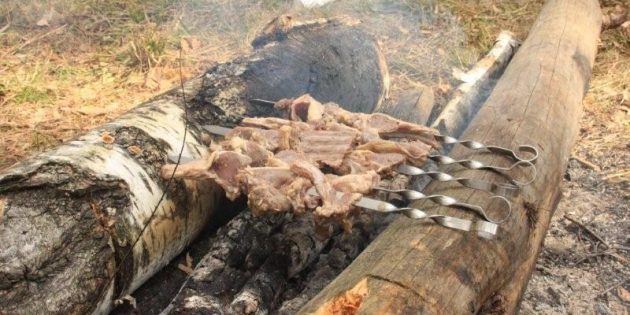 Когда костер догорит и уголь будет готов, по краям его надо положить две колоды параллельно друг другу на расстоянии. Затем на бревна надо положить шампуры с мясом.