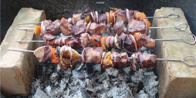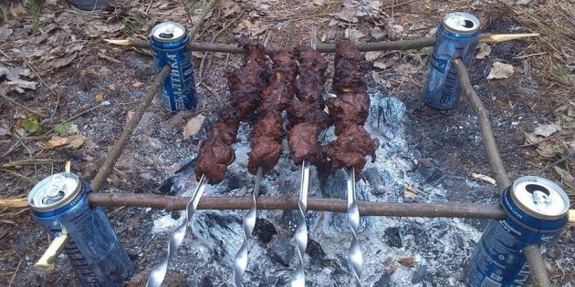 Пожарить шашлыки можно и с использованием четырех жестяных баночек из-под пива или другого напитка объемом 0,5 л. В их верхней части нужно сделать сквозные отверстия с помощью шампуров, ножа или заостренных прутьев, а затем соединить банки между собой теми же шампурами или прутьями.