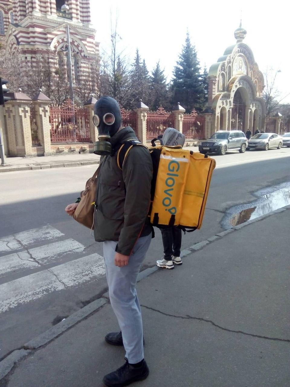 В Харькове заметили курьера популярной службы доставки Glovo в странном виде.