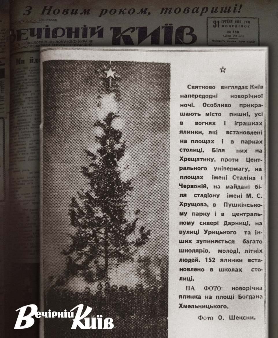 Издание показало архивный номер газеты от 31 декабря 1951 года, в материале которого рассказывали о том, как Киев украсили к празднику.